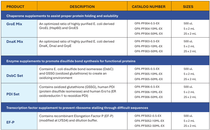 | Do you have a challenging protein to express? There is a variety of supplements available to optimize expression of your protein with the PUREfrex system. |