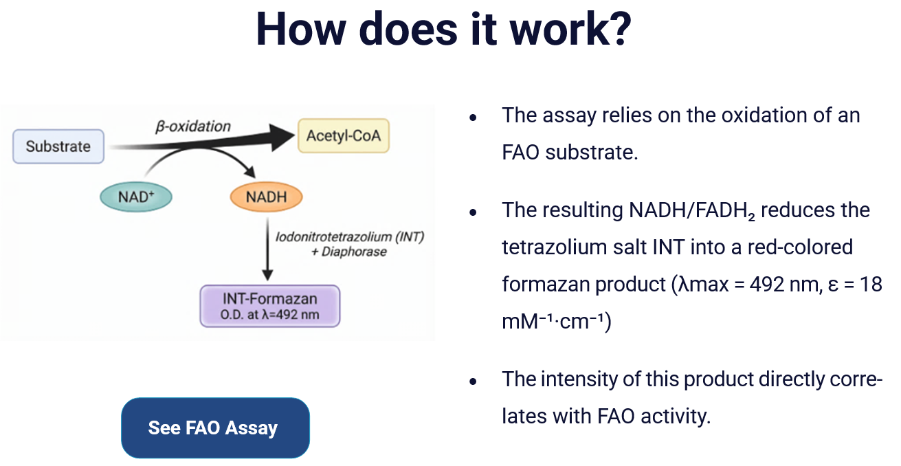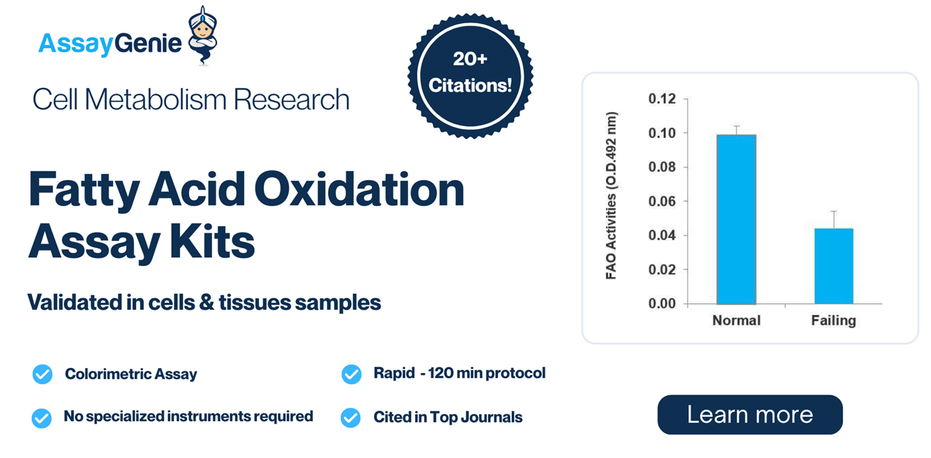 | The Assay Genie Fatty Acid Oxidation (FAO) Assay Kit offers a fast, reliable, colorimetric method to quantify fatty acid β-oxidation in cells and tissue lysates. This assay delivers direct functional measurements in under 120 minutes, using only a standard plate reader (492 nm), no specialised equipment required! |